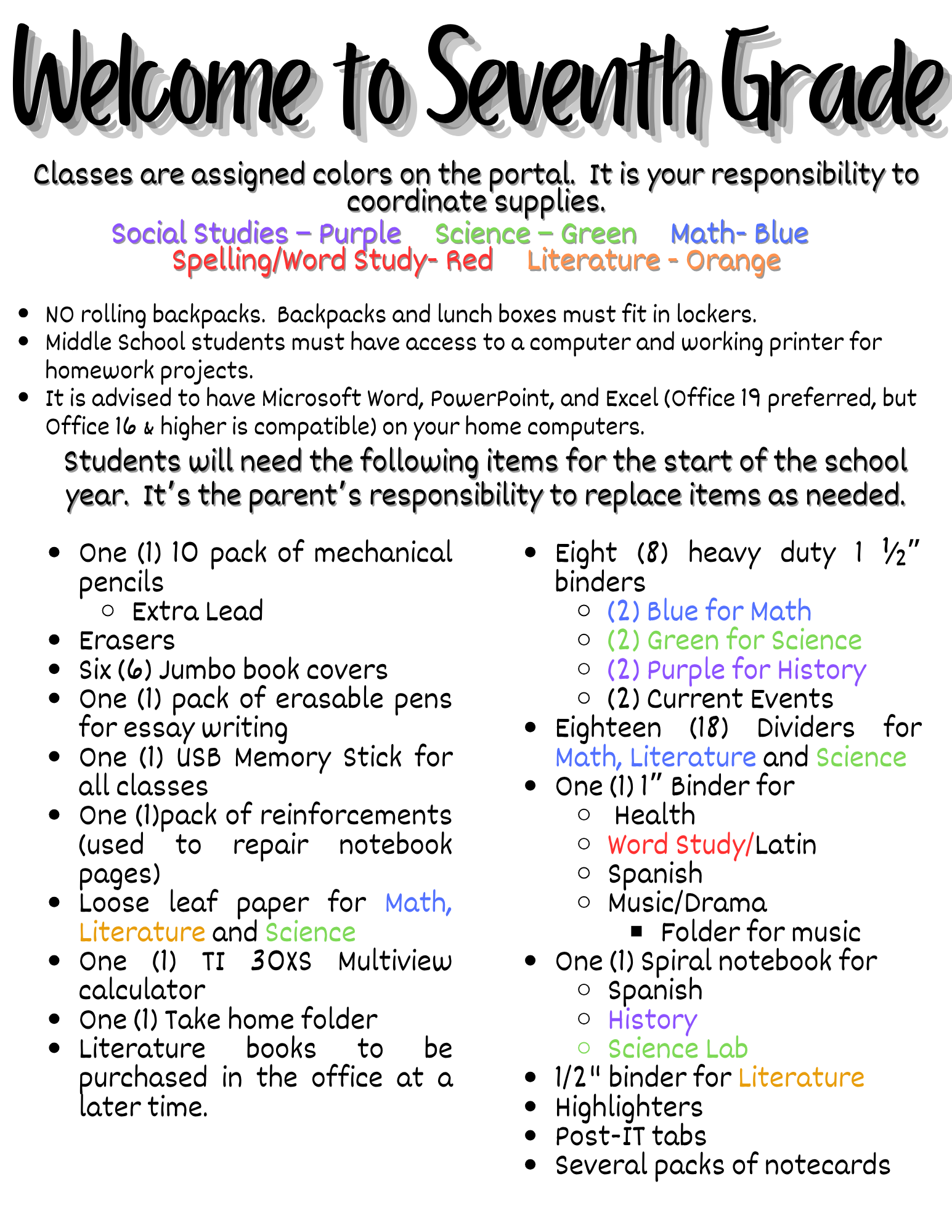 Downloadable Content Seventh Grade Supply List Contact our school today to arrange a private tour at your convenience. Call or Fill out the form below Call (570) 823-7574 CompanyThis field is for validation purposes and should be left unchanged.Parent/Guardian Name(Required) First Last Student Name(Required) First Last Student Age(Required)Grade(Required)KindergartenFirst GradeSecond GradeThird GradeFourth GradeFifth GradeSixth GradeSeventh GradeEighth GradeContact Email(Required) Contact Phone(Required)Referred By (Optional)CAPTCHA